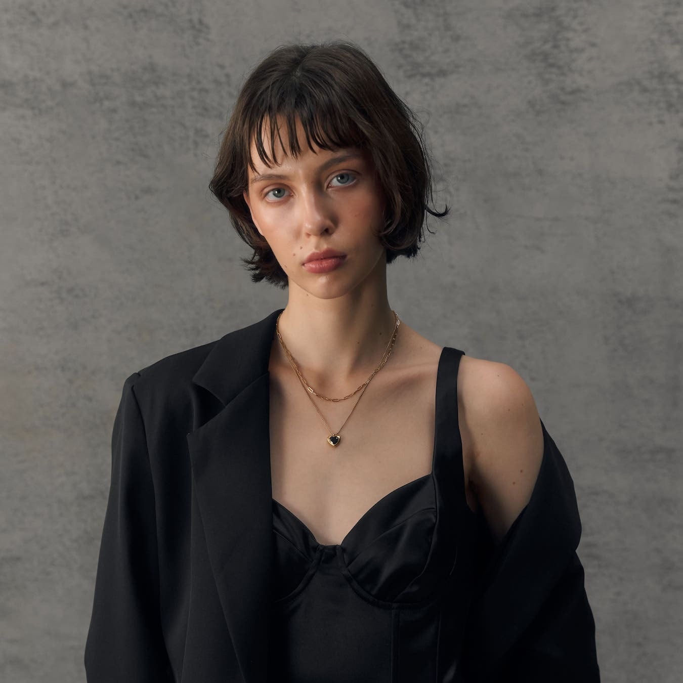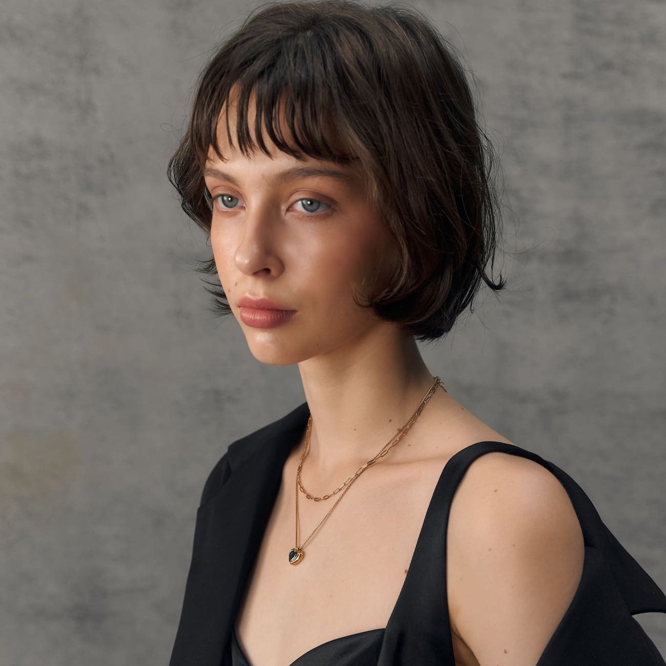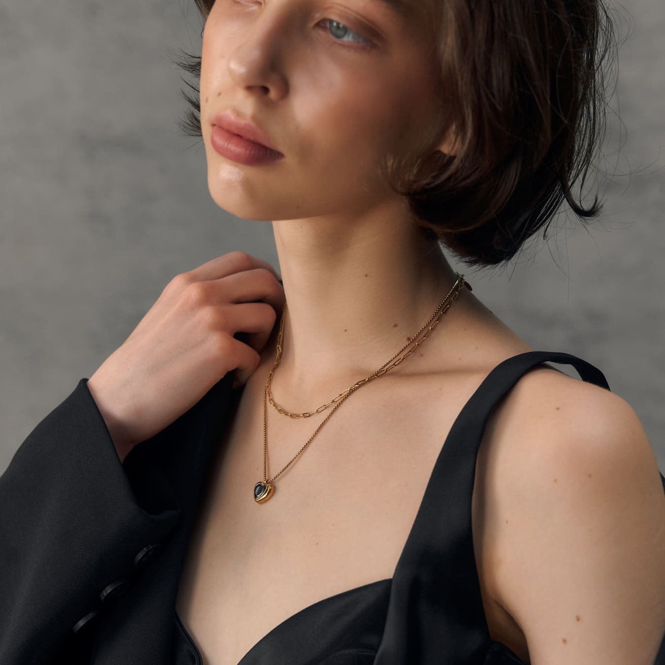 ”可愛い”だけに収まらず、艶やかなブラックが肌のトーンを引き締め、シンプルなスタイリングに合わせるだけで、洗練された印象へと導きます。日常の装いはもちろん、特別な日の装いにもそっと寄り添う、大人のためのエレガントなハートジュエリー。