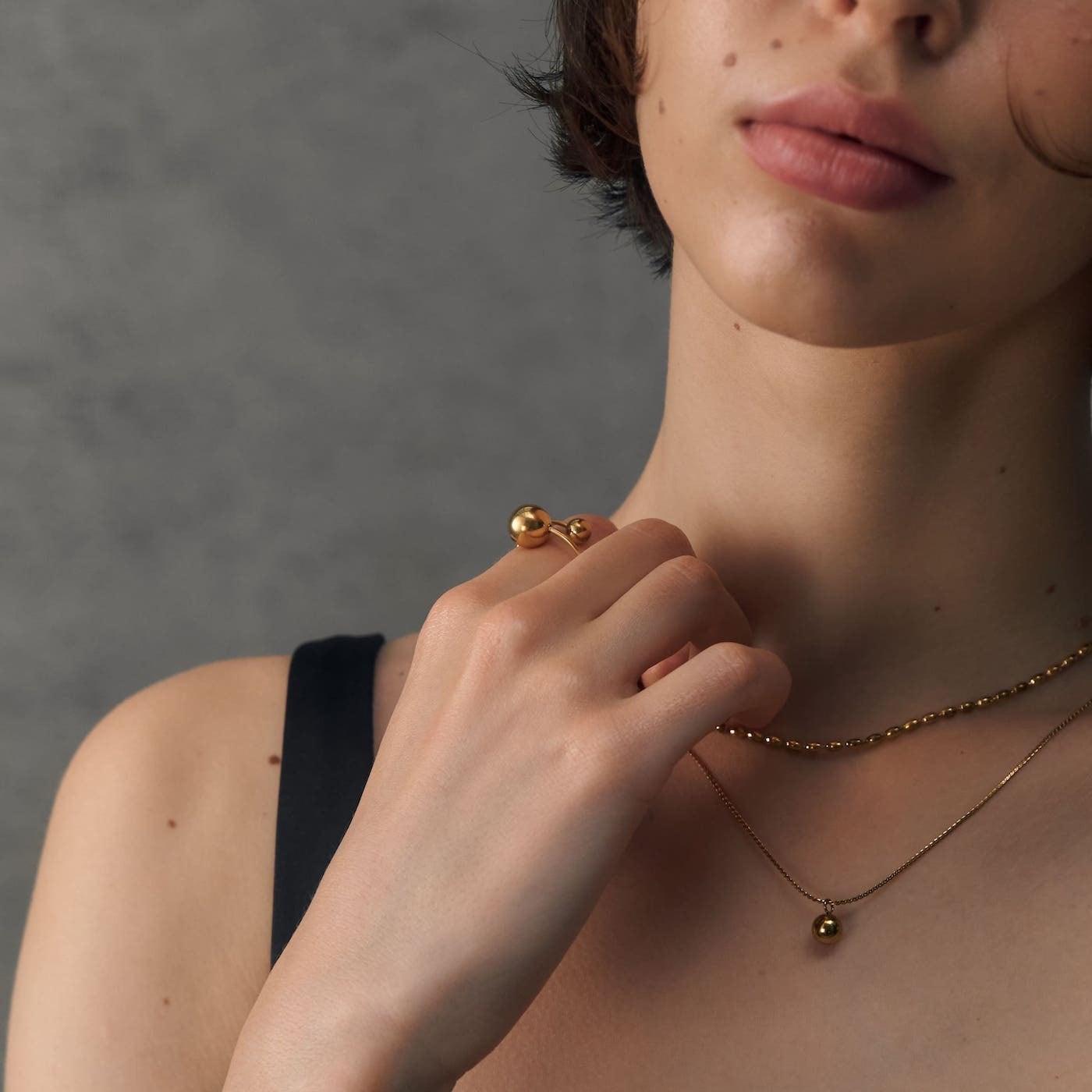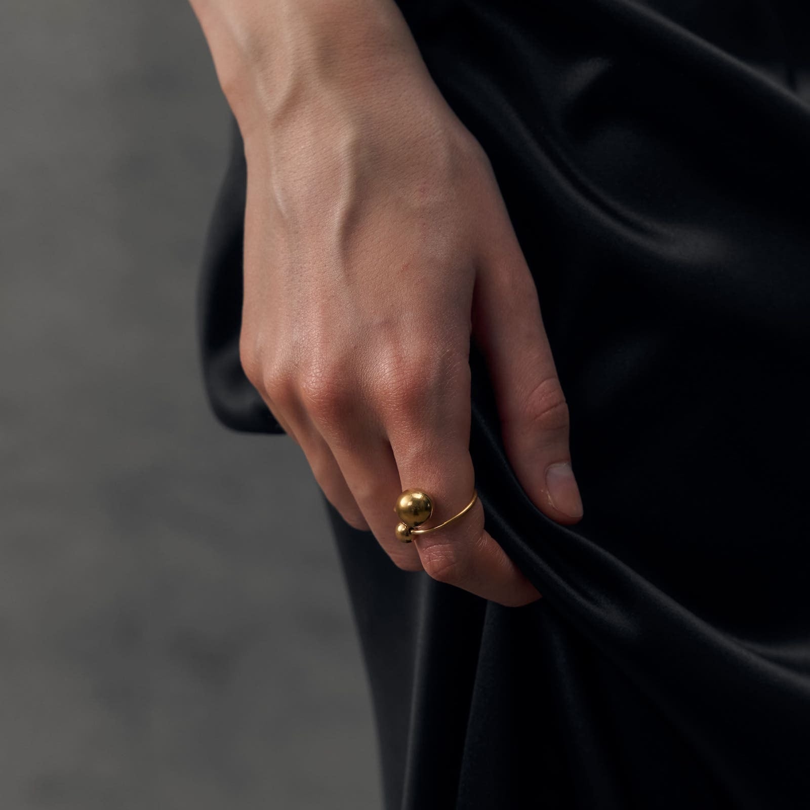 異なるサイズの球体がエレガントに配置され、指を繊細に飾り立てます。日常使いにも特別な日にもぴったりの、モダンで魅力的なアクセサリーです。