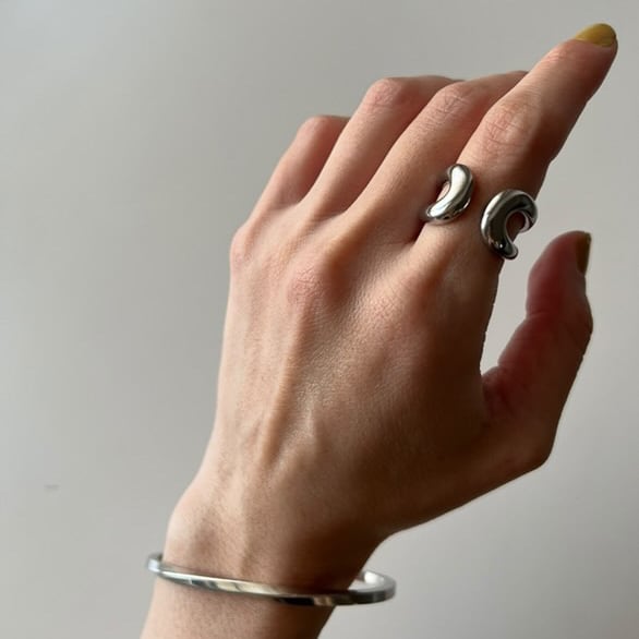流れるようなラインと空間を巧みに利用した形状が特徴です。柔らかなカーブが手元をエレガントに彩り、どんな装いにも洗練された印象を加えます。独特のデザインで、ファッションのアクセントとして最適なアイテムです。